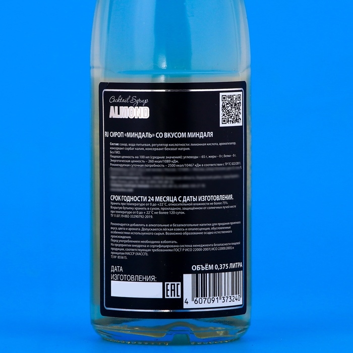 Для производства сиропа Миндаль, как и другой продукции, компания Barline использует только натуральное сырье, что делает его не просто вкусной, но и на 100% безопасной пищевой добавкой. В продукте полностью отсутствуют синтетические ароматизаторы, красители и консерванты, а задачи последнего выполняет сахар. Его содержание в сиропе составляет 65%, это обуславливает получение показателей калорийности 260 ккал на 100 мл продукта.