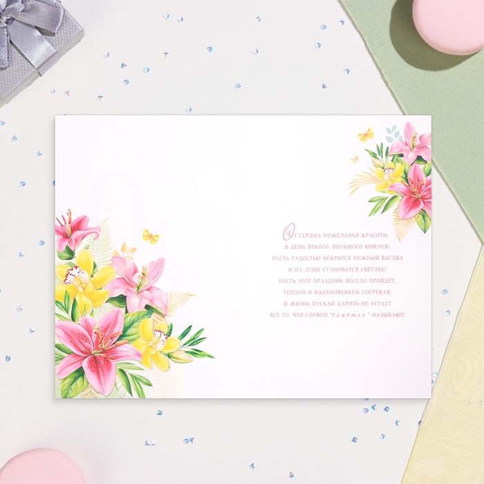 Открытка "С Юбилеем 50!" лилии, тиснение, глиттер, А4