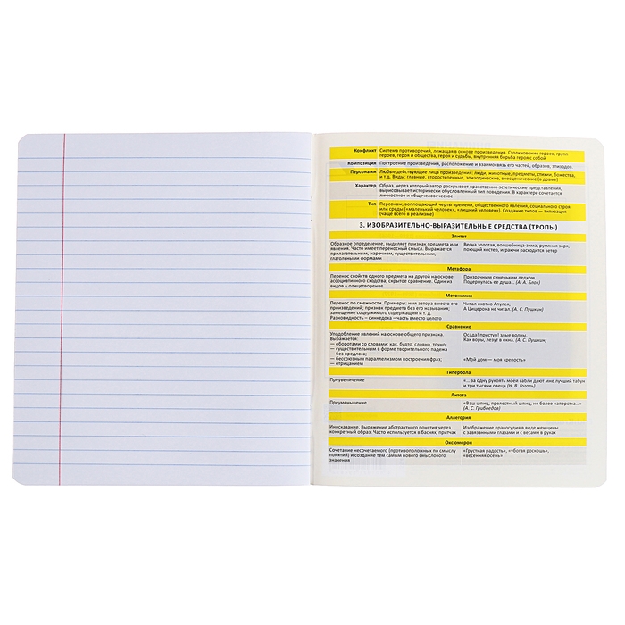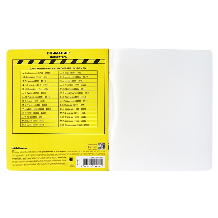 Тетрадь предметная формата А5+ (170x203 мм). Двойная обложка: внешняя выполнена из высококачественного износостойкого прозрачного пластика с фактурой "апельсиновая корка", внутренняя — из качественной мелованной бумаги. В блоке 48 листов в линейку с полями. Бумага офсетная плотностью 60 г/м2. Белизна бумаги - 100%. Цвет линовки - синий. Скругленные уголки обложки и блока. Тип скрепления - скоба. Имеет инфо-блок с кратким изложением школьной программы. Тетради упакованы в термоусадочную плёнку по 5 штук.