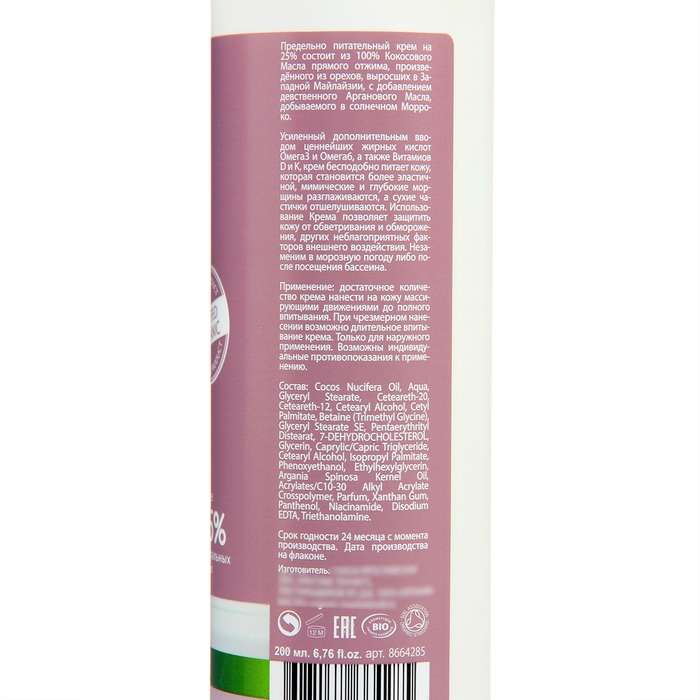 Предельно питательный крем на 25% состоит из 100% Кокосового Масла прямого отжима, произведённого из орехов, выросших в Западной Майлайзии, с добавлением девственного Арганового Масла, добываемого в солнечном Морроко.