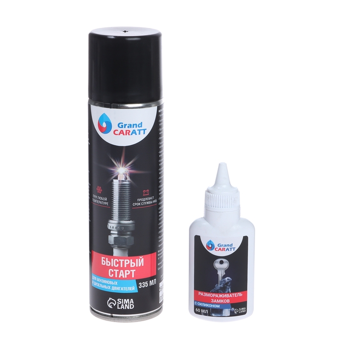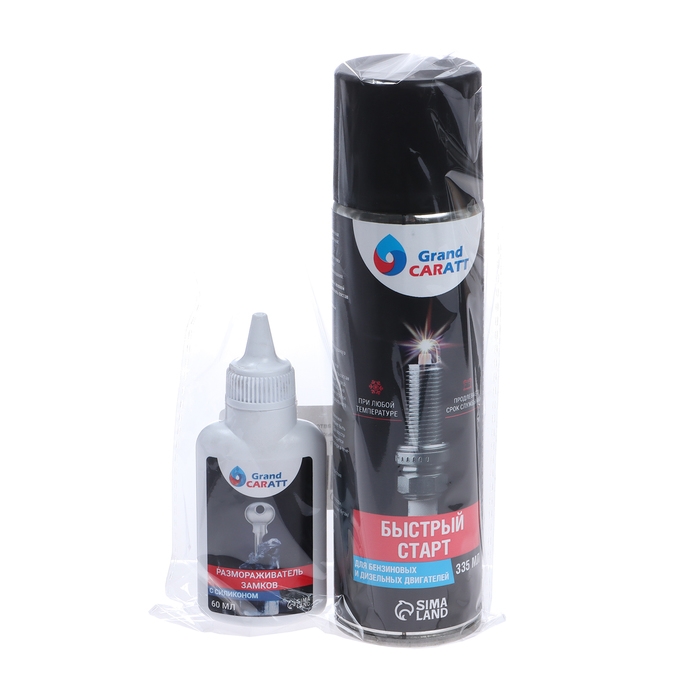 Набор автомобильный «Быстрый старт» от Grand Caratt включает в себя два средства: быстрый старт для двигателя и размораживатель. Эти средства предназначены для использования в автомобилях с бензиновыми и дизельными двигателями в условиях пониженных температур и высокой влажности.