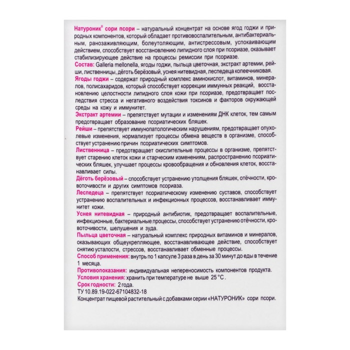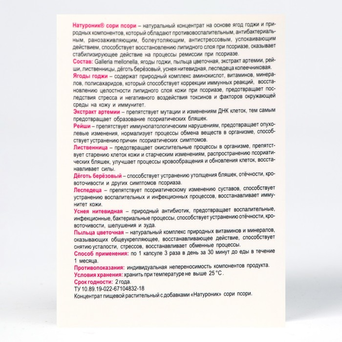 Природные компоненты способны комплексно воздействовать на причину, очаг, симптомы и сопутствующие изменения органов и систем при псориазе. Натуральные природные компоненты не вызывают привыкания, побочных эффектов и ухудшения состояния других систем организма (иммунная, пищеварительная и так далее).