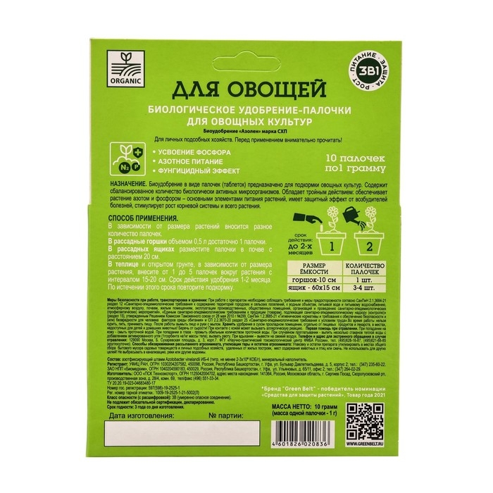Биоудобрение в виде палочек (таблеток) предназначено для подкормки овощных культур. Содержит сбалансированное количество биологически активных микроорганизмов. Обладает тройным действием: обеспечивает растение азотом и фосфором – основными элементами питания растений, имеет защитный эффект от возбудителей болезней, стимулирует рост корневой системы и всего растения.Уникальное удобрение для овощей длительного действияНасыщает биологическим азотом и фосфоромУвеличивает количество плодов и качество урожая. Разместите палочки в почве между стеблем растения и краем цветочного горшка.Расстояние между палочками:20х15 см - в балконных ящиках15х20 см - в открытом грунте. Состав: Азотофиксирующий штамм Azotobacter vinelandi ИБ- 4/титр не менее 2-3х109 КОЕ/г