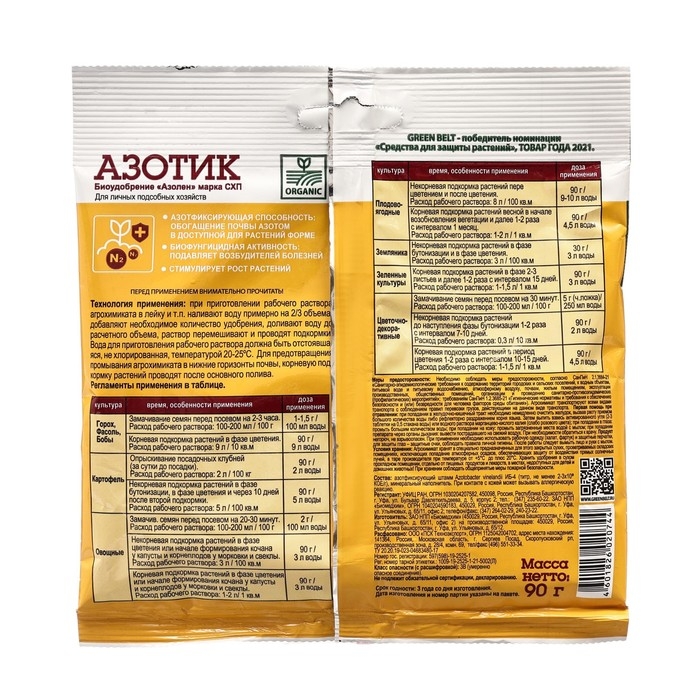 Активатор плодородия. Обогащает почву азотом в доступной для растений форме. Подавляет возбудителей болезней. Стимулирует рост растений. Препарат "Азотик" от Green Belt – это новейшее азотофиксирующее биоудобрение, разработано специально для корневой и некорневой подкормок. Способ применения: Вода для приготовления рабочего раствора должна быть отстоявшаяся, не хлорированная, с температурой 20-25 0С.При приготовлении рабочего раствора агрохимиката в лейку наливают воду до расчетного объема, насыпают необходимое количество агрохимиката раствор перемешивают и проводят подкормки. Для предотвращения промывания агрохимиката в нижние горизонты почвы, корневую подкормку растений проводят после основного полива.