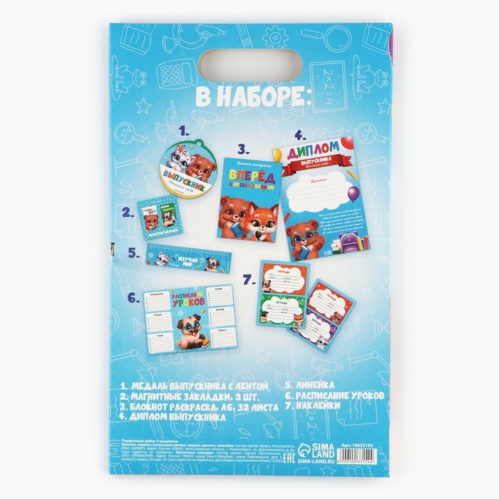 Блокнот, Диплом, Закладка, Линейка, Медаль, Наклейки, Расписание