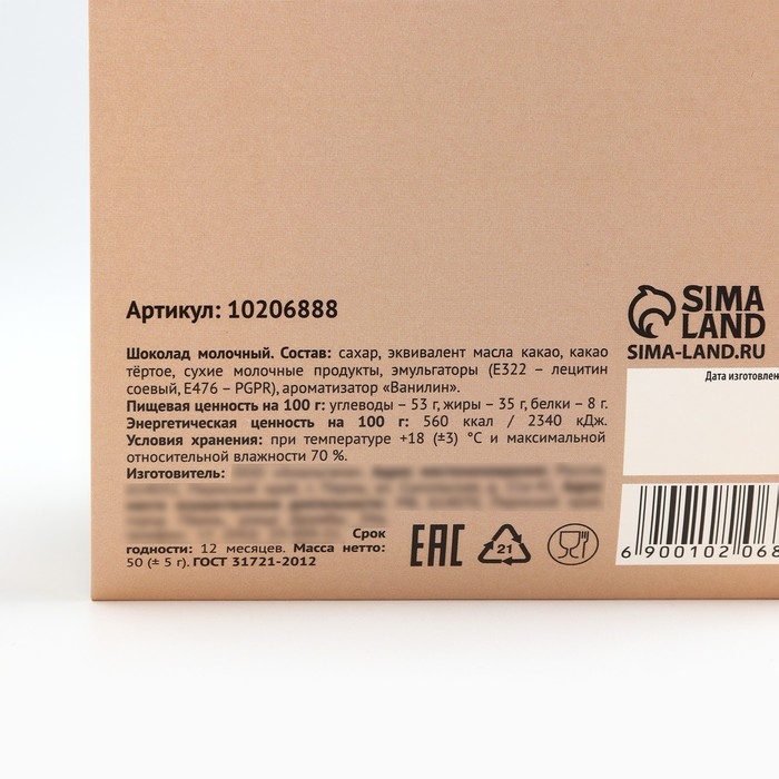 Состав: сахар, эквивалент масла какао, какао тёртое, сухие молочные продукты, эмульгаторы (Е322 - лецитин соевый, Е476 - PGPR), ароматизатор "Ванилин".