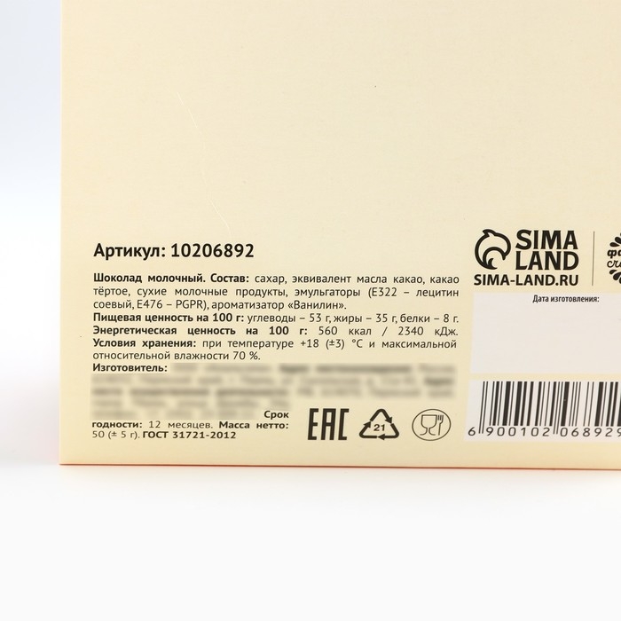 Состав: сахар, эквивалент масла какао, какао тёртое, сухие молочные продукты, эмульгаторы (Е322 - лецитин соевый, Е476 - PGPR), ароматизатор "Ванилин".