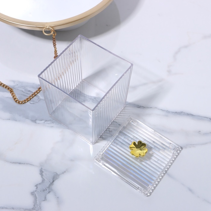- Эстетика и функциональность: Прозрачный корпус позволяет быстро находить нужные предметы, а золотистая крышка добавляет нотку изысканности.