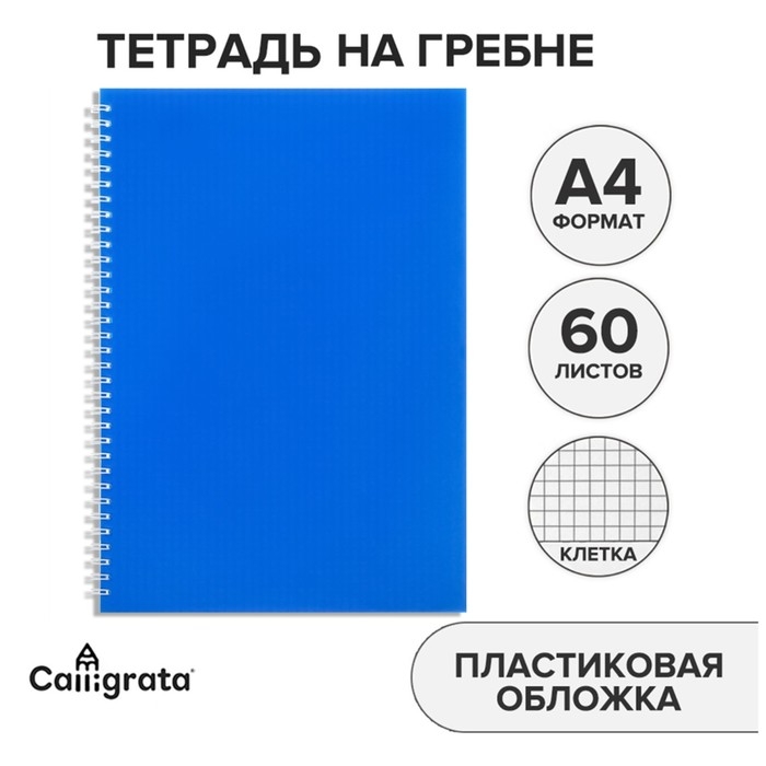 Тетрадь на гребне A4 60 листов в клетку Calligrata Синяя, пластиковая обложка, блок офсет