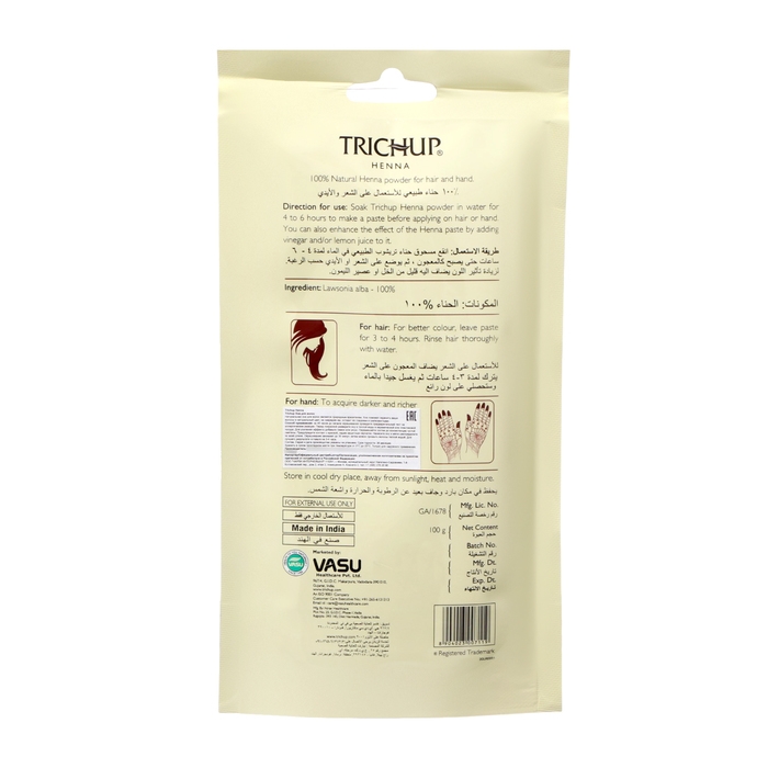 Хна Vasu Trichup - это 100% натуральная хна для волос и мехенди в порошке, сертифицированная GMP и не содержащая консервантов. Она подходит для всех типов волос, не тестируется на животных и идеально подходит для создания рисунков мехенди на руках и ногах.