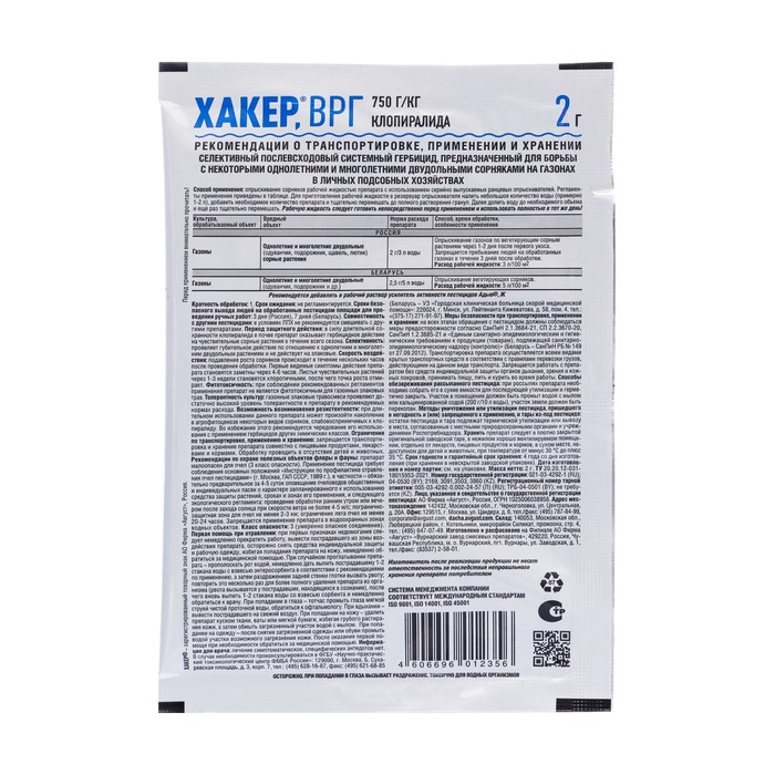 Высококонцентрированное средство избирательного действия для борьбы с сорняками на газоне. Хакер – гербицид избирательного действия для борьбы с сорняками на газоне.Содержит повышенную концентрацию действующего вещества и с легкостью уничтожает двудольные сорняки, такие как одуванчик, осоты, подорожник, щавель, лютик и другие, при этом не повреждает злаковую газонную траву. Препарат разводится в пропорции 2,5 г (одна упаковка) на 5 л воды, приготовленной жидкостью можно опрыскать 100 кв.м. газона. Обработки проводят после укоса, по участкам с проросшими сорняками. Поглощаясь листьями, Хакер переносится к точкам роста, корням и корневищам, нарушая процесс деления клеток и развитие растения. Через несколько дней листья сорняков скручиваются и желтеют, по истечении 1-3 недель наступает их окончательная гибель.Применять Хакер нужно согласно инструкции. Как и любой другой гербицид, приготовление рабочего раствора производится путём разведения гранул сначала в небольшом количестве воды (до 1 литра), а затем добавления воды до необходимого количества. Рабочий раствор хранению не подлежит, то есть использовать его нужно сразу. Опрыскивание проводится по листьям и стеблям в безветренную погоду, желательно в утренние (до 10:00) и вечерние (после 18:00) часы. Обладает системным действием.Легко перемещается по растению, нарушая процесс деления клеток и прекращая его рост.Уничтожает различные виды сорняков, в т.ч. одуванчик, ромашку, бодяк, виды осота, паслён и др.Подавляет рост сорняков, не повреждая злаковые газонные травы.