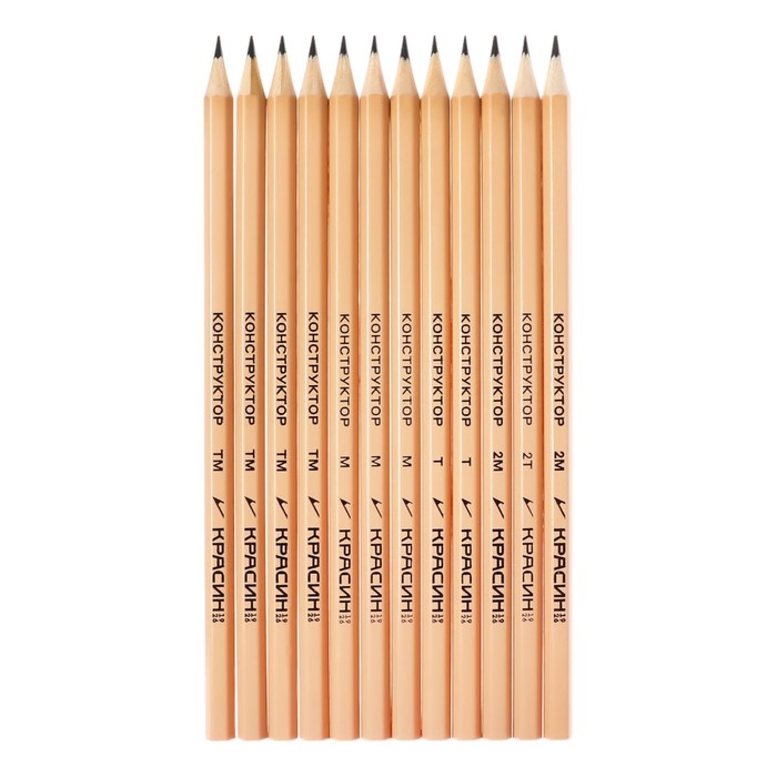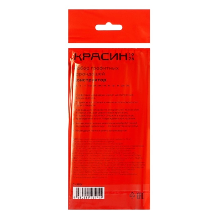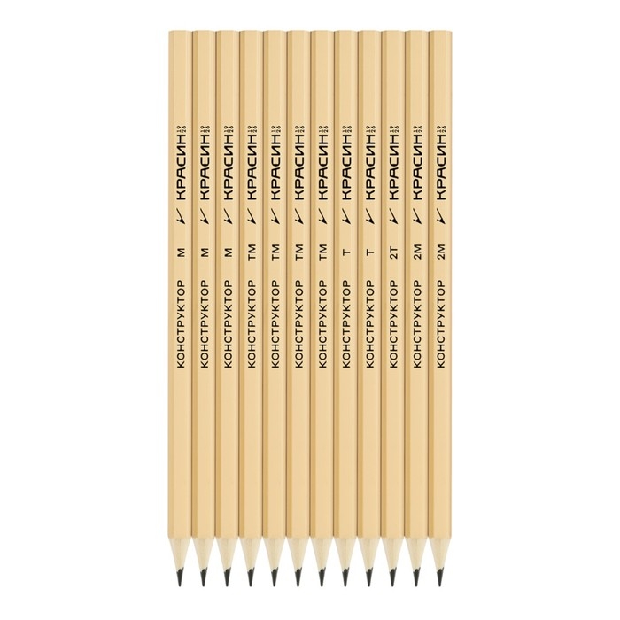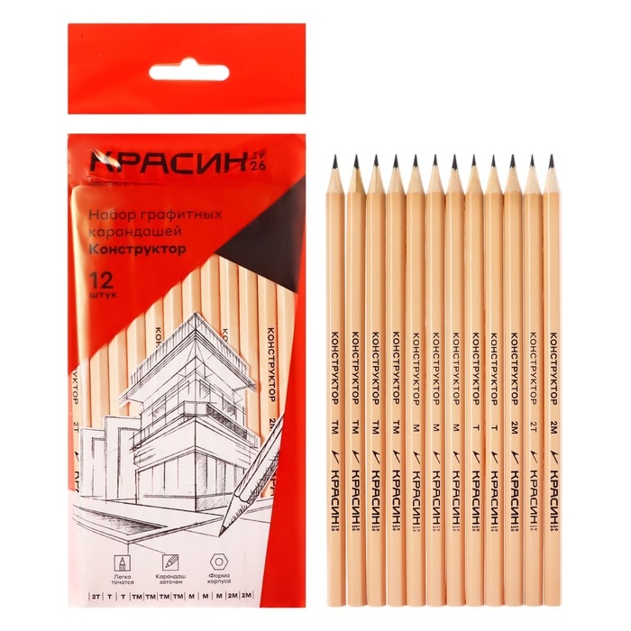 Набор карандашей чёрнографитных Красин "Конструктор" 2Н, 2xН, 4хНВ, 3xВ, 2В, шестигранные, европодвес, 12 штук