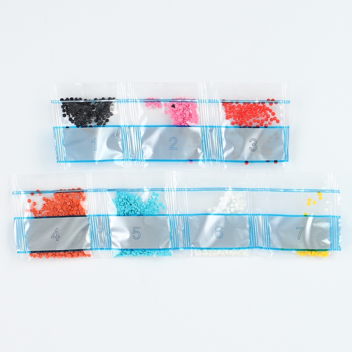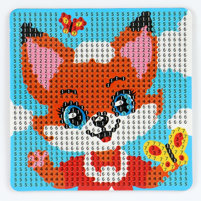 С помощью специального карандаша вам нужно разложить стразы по нарисованной схеме с обозначением необходимых цветов.