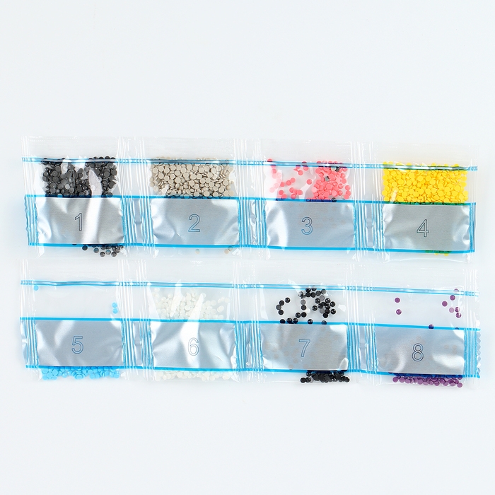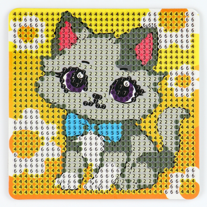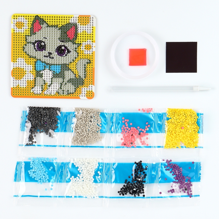 С помощью специального карандаша вам нужно разложить стразы по нарисованной схеме с обозначением необходимых цветов.