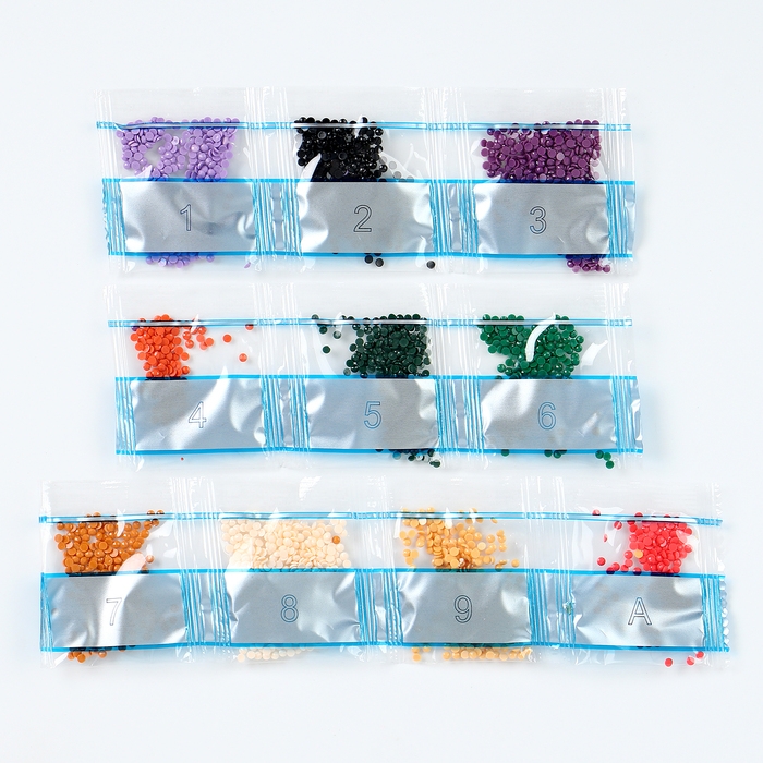 С помощью специального карандаша вам нужно разложить стразы по нарисованной схеме с обозначением необходимых цветов.