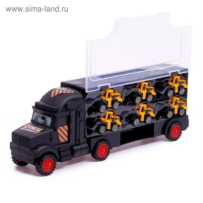 - Грузовик способен перевозить до 6 машинок масштабом 1:64 в своём кузове.