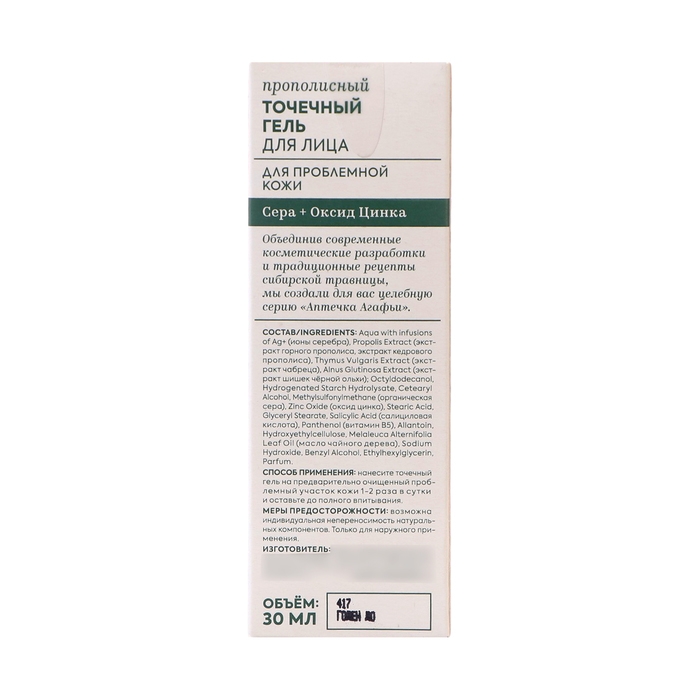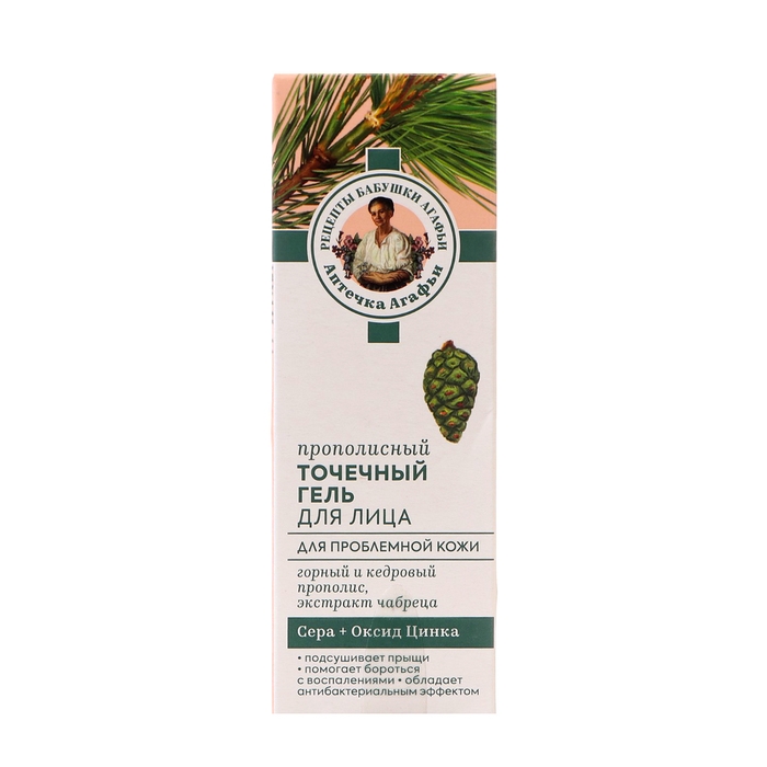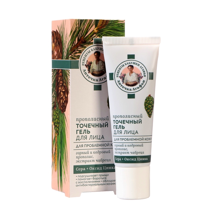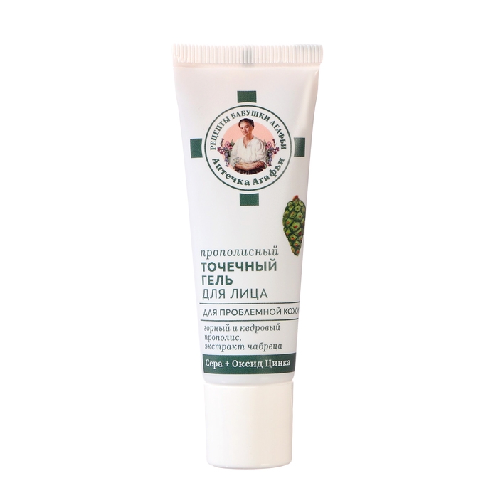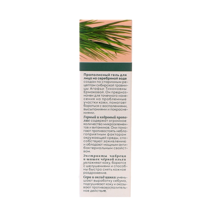 Прополисный гель для лица на серебряной воде создан по старинным рецептам сибирской травницы Агафьи Тихоновны Ермаковой. Он предназначен для точечного нанесения на проблемные участки кожи, помогает бороться с воспалениями, высыпаниями и покраснениями.