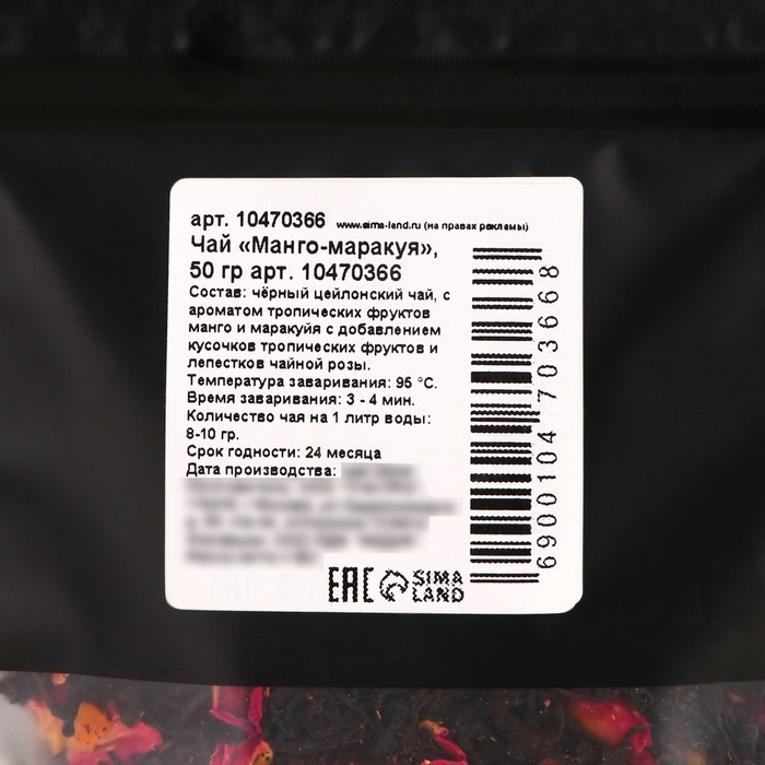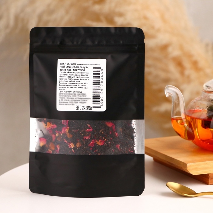 Состав: чёрный цейлонский чай с ароматом тропических фруктов манго и маракуйи с добавлением кусочков тропических фруктов и лепестков чайной розы.