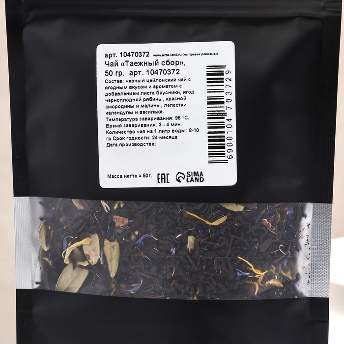 Состав: чёрный цейлонский чай, лист брусники, ягода черноплодной рябины, красной смородины, малины, лепестки календулы и василька.