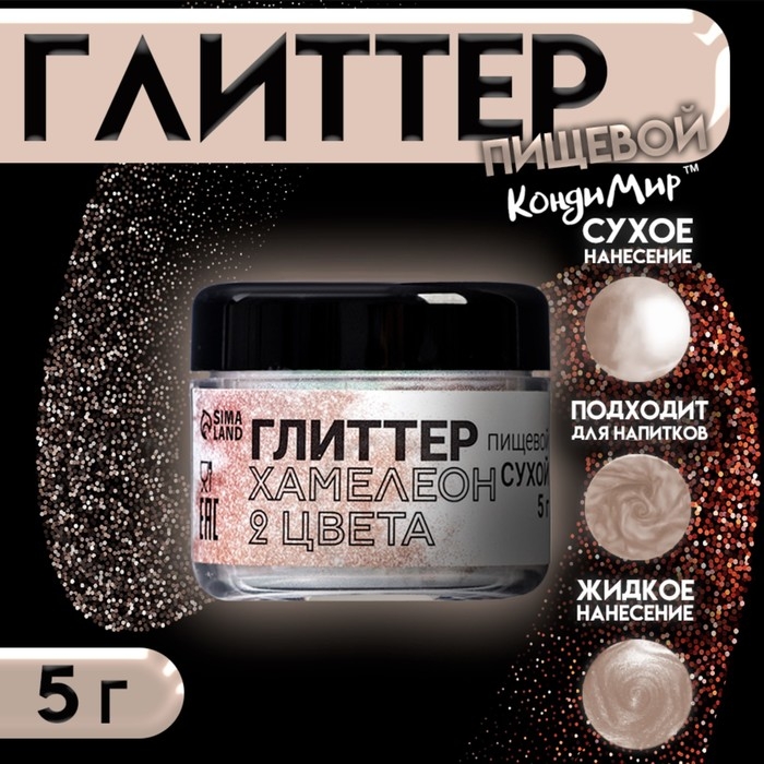 Пищевые глиттеры не имеют вкуса и запаха, а значит не меняют вкуса и аромата готовых кондитерских изделий. Данный продукт плотный и отлично покрывает как твердые поверхности, так и изделия с жидкой текстурой. Подойдет для продуктов любой температуры. Краситель на 100% съедобен. Окрашивайте готовые изделия, напитки, элементы декора, а также глазурь, айсинг, желе, мармелад, карамель.