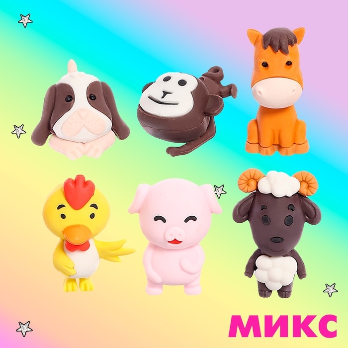 Игровой набор ластиков «Зверята» - это интересное дополнение для игр с куклами и пупсами. В наборе 6 ярких ластиков, каждое из которых выполнено в виде питомцев, что делает игру увлекательнее.
