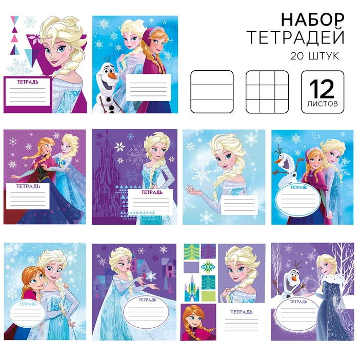 Набор тетрадей 20 штук, 12 листов, 1 сентября, в клетку и линейку, обложка мелованная бумага, Холодное сердце