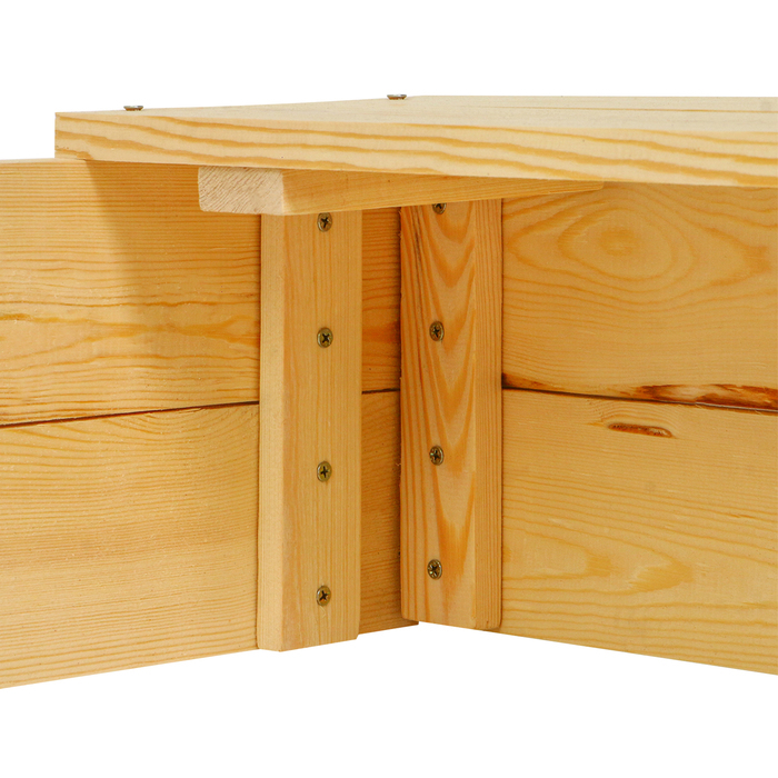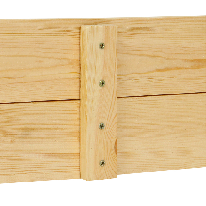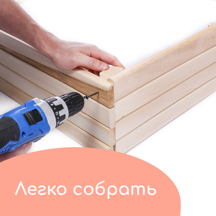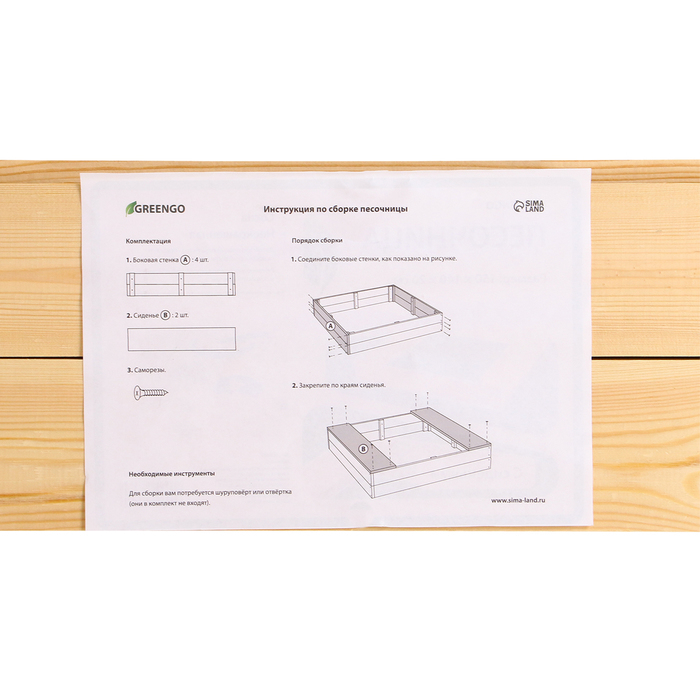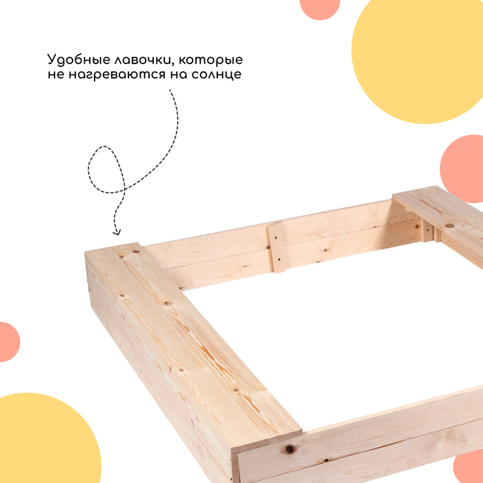 - Долгий срок службы. Песочница сделана из сосны, древесина хорошо переносит перепады температур, не разрушится и не испортится на солнце.