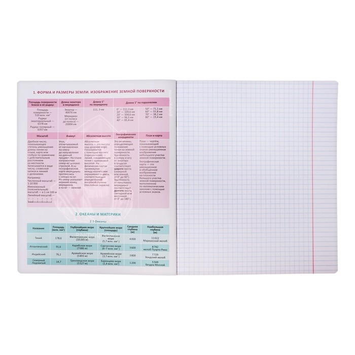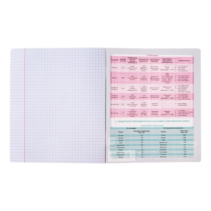 Тетрадь предметная формата А5+ (170x203 мм). Двойная обложка: внешняя выполнена из высококачественного износостойкого прозрачного пластика с фактурой «песок», внутренняя — из качественной мелованной бумаги. В блоке 48 листов в клетку с полями. Бумага офсетная плотностью 60 г/м2. Белизна бумаги - 100%. Цвет линовки - синий. Скругленные уголки обложки и блока. Тип скрепления - скоба. Имеет инфо-блок с кратким изложением школьной программы. Тетради упакованы в термоусадочную плёнку по 5 штук.