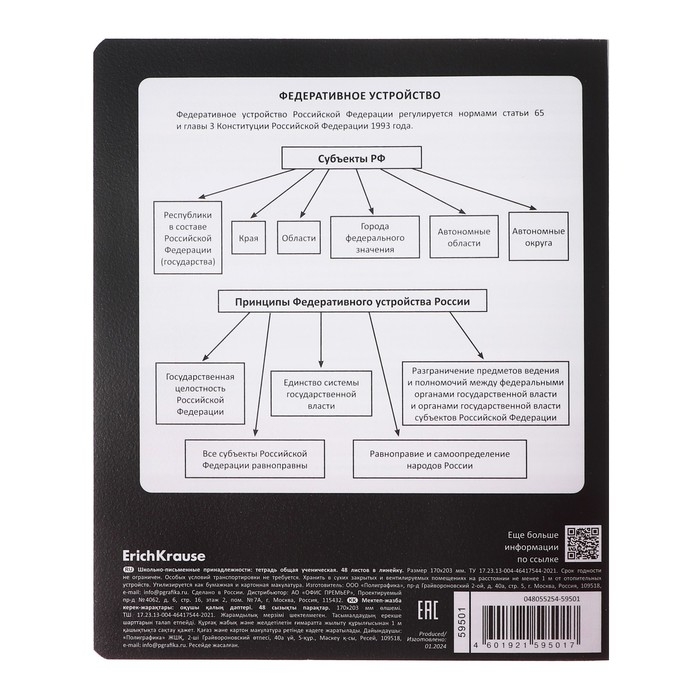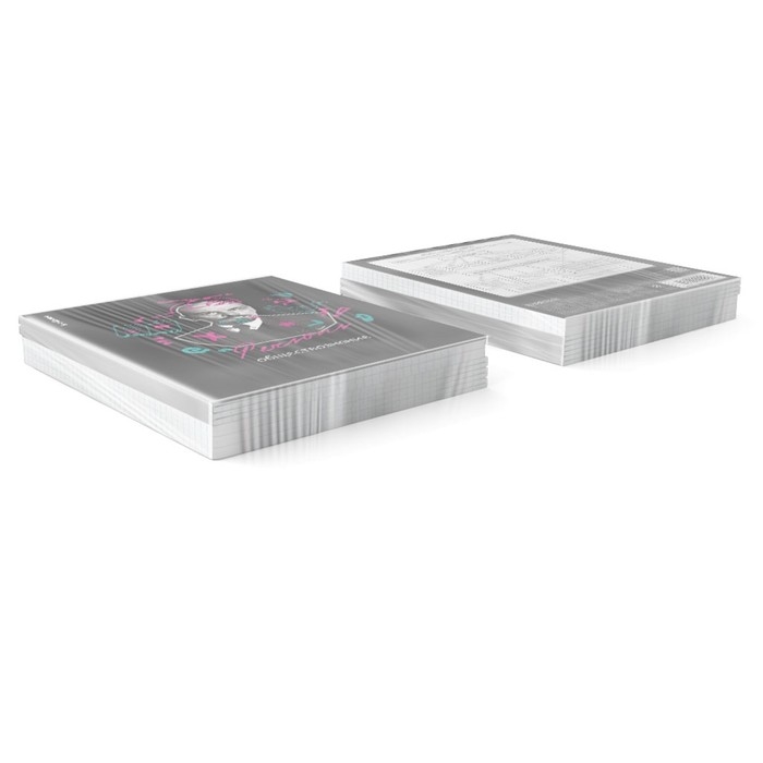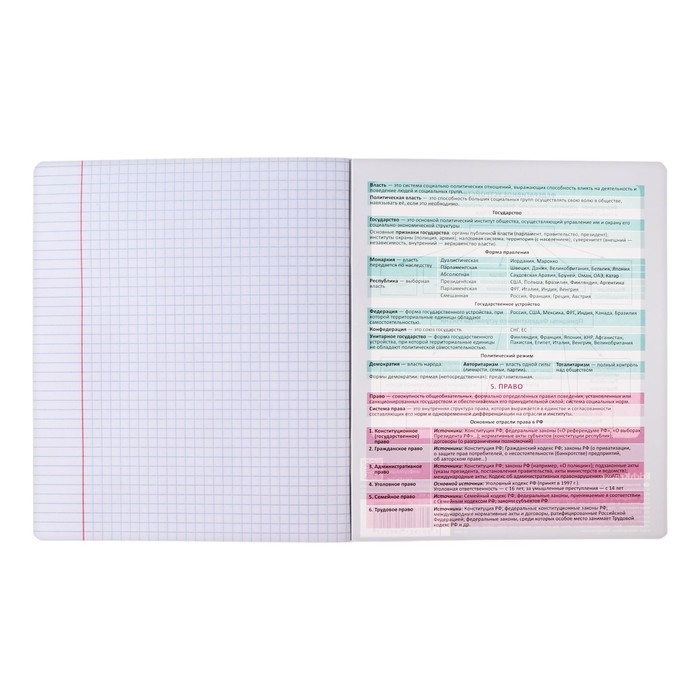 Тетрадь предметная формата А5+ (170x203 мм). Двойная обложка: внешняя выполнена из высококачественного износостойкого прозрачного пластика с фактурой «песок», внутренняя — из качественной мелованной бумаги. В блоке 48 листов в клетку с полями. Бумага офсетная плотностью 60 г/м2. Белизна бумаги - 100%. Цвет линовки - синий. Скругленные уголки обложки и блока. Тип скрепления - скоба. Имеет инфо-блок с кратким изложением школьной программы. Тетради упакованы в термоусадочную плёнку по 5 штук.