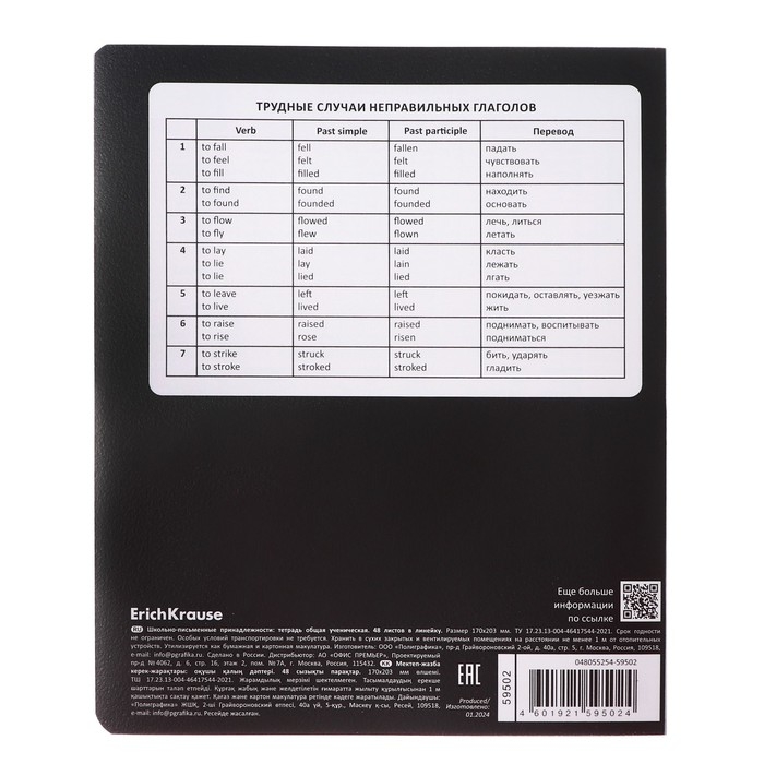 Тетрадь предметная формата А5+ (170x203 мм). Двойная обложка: внешняя выполнена из высококачественного износостойкого прозрачного пластика с фактурой «песок», внутренняя — из качественной мелованной бумаги. В блоке 48 листов в клетку с полями. Бумага офсетная плотностью 60 г/м2. Белизна бумаги - 100%. Цвет линовки - синий. Скругленные уголки обложки и блока. Тип скрепления - скоба. Имеет инфо-блок с кратким изложением школьной программы. Тетради упакованы в термоусадочную плёнку по 5 штук.