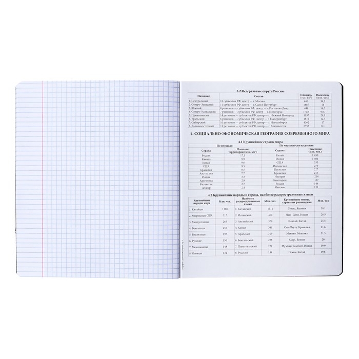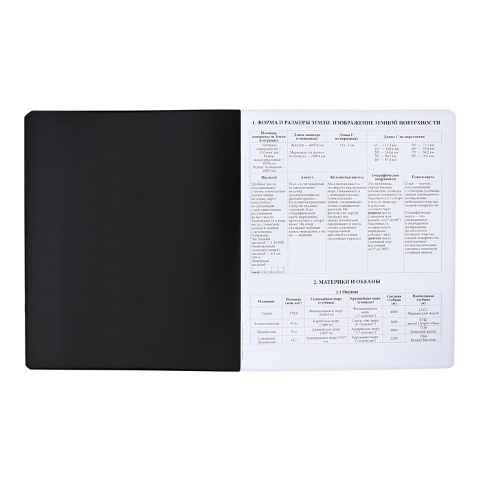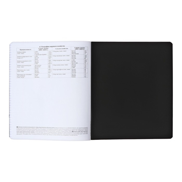 Тетрадь предметная формата А5+ (170x203 мм). Двойная обложка: внешняя выполнена из высококачественного износостойкого черного пластика с фактурой «песок», внутренняя — из качественной мелованной бумаги. В блоке 48 листов в клетку с полями. Бумага офсетная плотностью 60 г/м2. Белизна бумаги - 100%. Цвет линовки - синий. Скругленные уголки обложки и блока. Тип скрепления - скоба. Имеет инфо-блок с кратким изложением школьной программы. Тетради упакованы в термоусадочную плёнку по 5 штук.