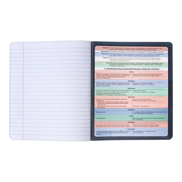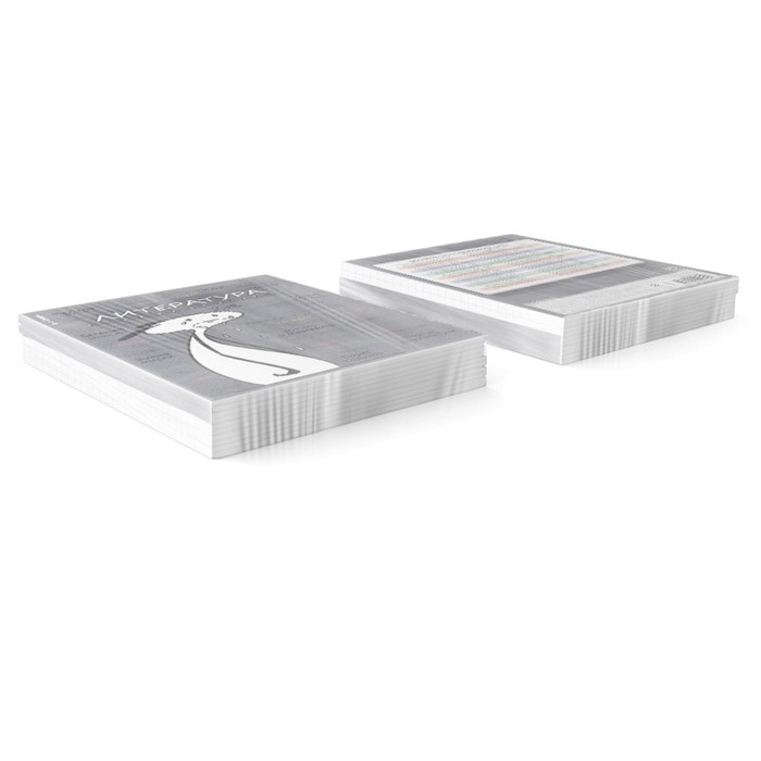 Тетрадь предметная формата А5+ (170x203 мм). Двойная обложка: внешняя выполнена из высококачественного износостойкого прозрачного пластика с фактурой «песок», внутренняя — из качественной мелованной бумаги. В блоке 48 листов в линейку с полями. Бумага офсетная плотностью 60 г/м2. Белизна бумаги - 100%. Цвет линовки - синий. Скругленные уголки обложки и блока. Тип скрепления - скоба. Имеет инфо-блок с кратким изложением школьной программы. Тетради упакованы в термоусадочную плёнку по 5 штук.