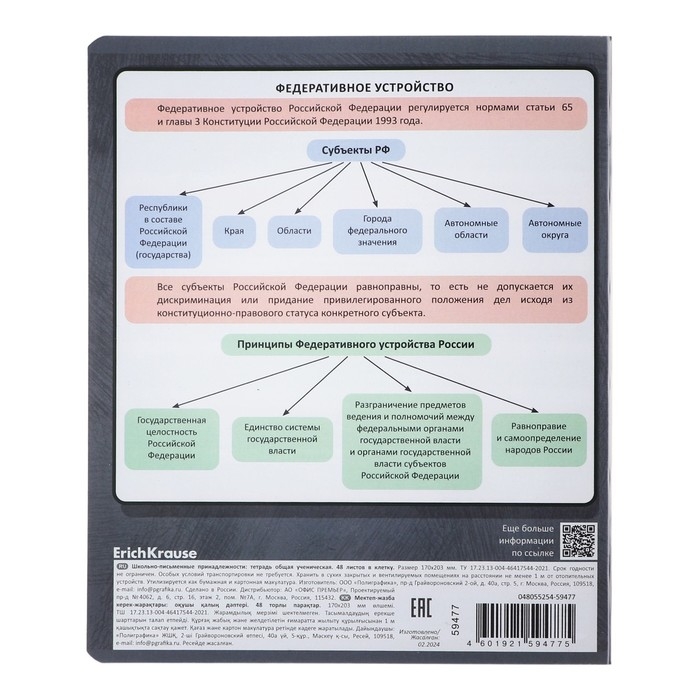 Тетрадь предметная формата А5+ (170x203 мм). Двойная обложка: внешняя выполнена из высококачественного износостойкого прозрачного пластика с фактурой «песок», внутренняя — из качественной мелованной бумаги. В блоке 48 листов в клетку с полями. Бумага офсетная плотностью 60 г/м2. Белизна бумаги - 100%. Цвет линовки - синий. Скругленные уголки обложки и блока. Тип скрепления - скоба. Имеет инфо-блок с кратким изложением школьной программы. Тетради упакованы в термоусадочную плёнку по 5 штук.