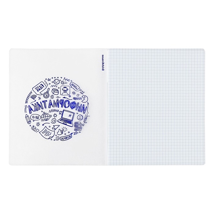 Тетрадь предметная формата А5+ (170x203 мм). Обложка выполнена из высококачественного износостойкого прозрачного пластика с фактурой «песок». В блоке 48 листов в клетку с полями. Бумага офсетная плотностью 60 г/м2. Белизна бумаги - 100%. Цвет линовки - синий. Скругленные уголки обложки и блока. Тип скрепления - скоба. Тетради упакованы в термоусадочную плёнку по 5 штук.