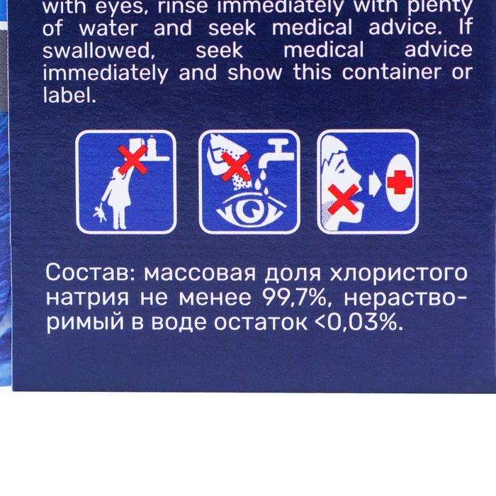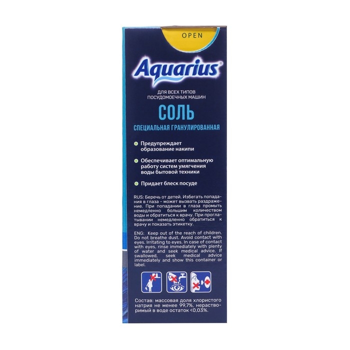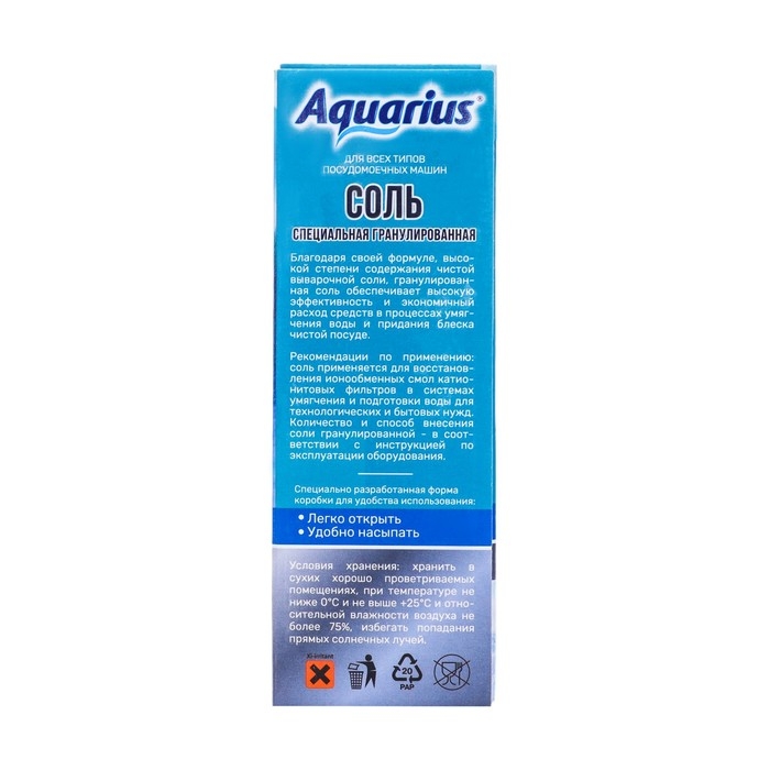 — Безопасность. Соль "Aquarius" не содержит вредных примесей и полностью безопасна для здоровья человека и окружающей среды.