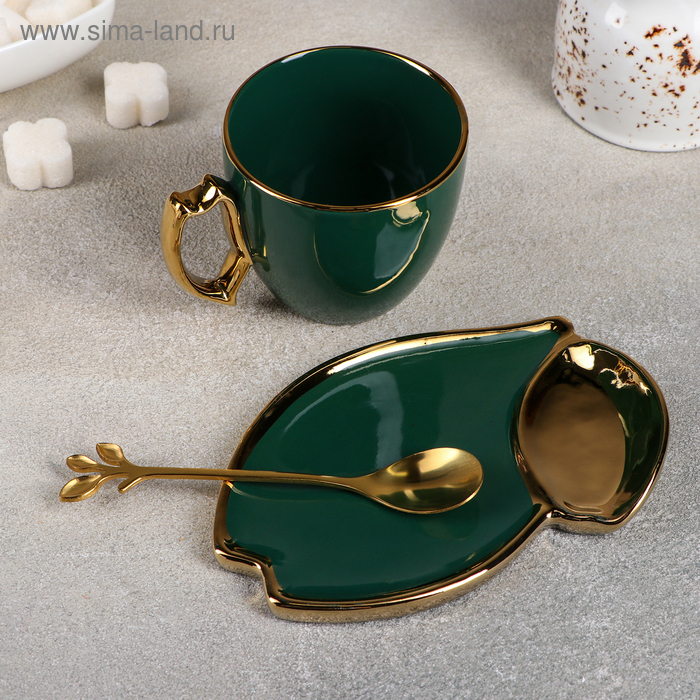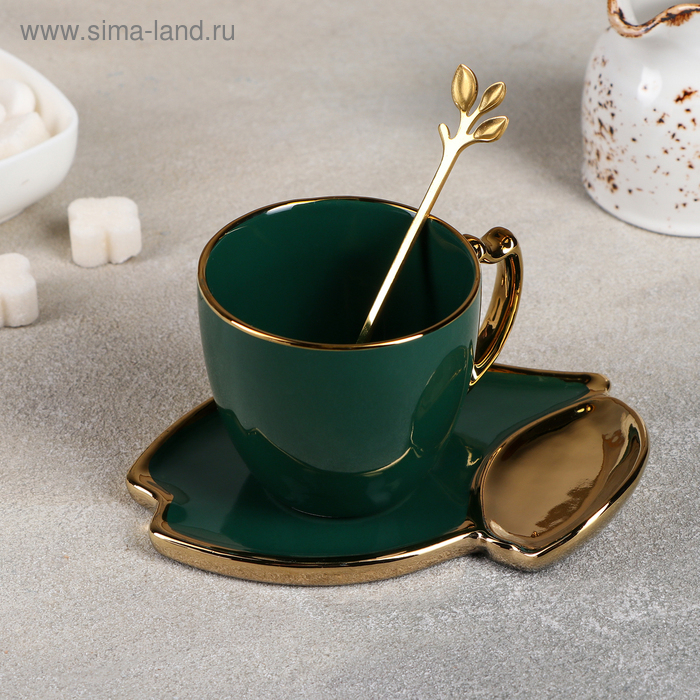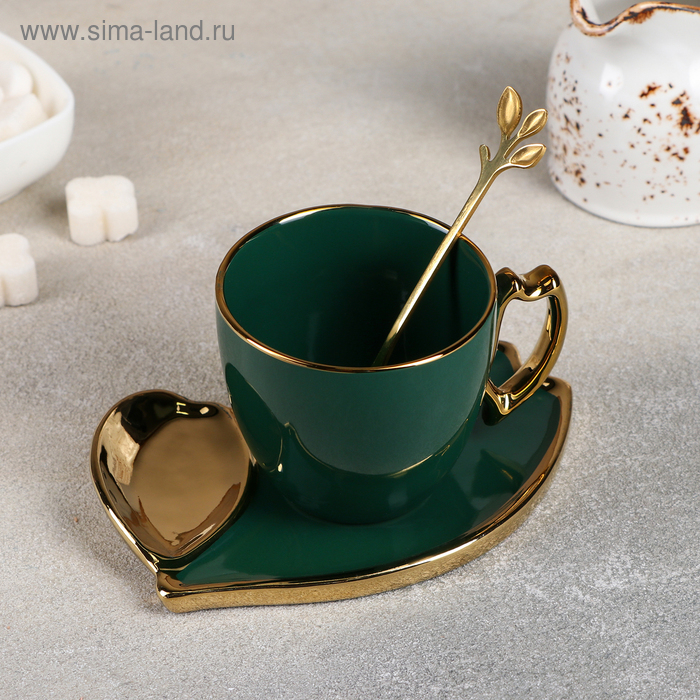 Чайная пара керамическая «Ливона», 3 предмета: чашка 200 мл, блюдце d=14 см, ложка, цвет изумрудный