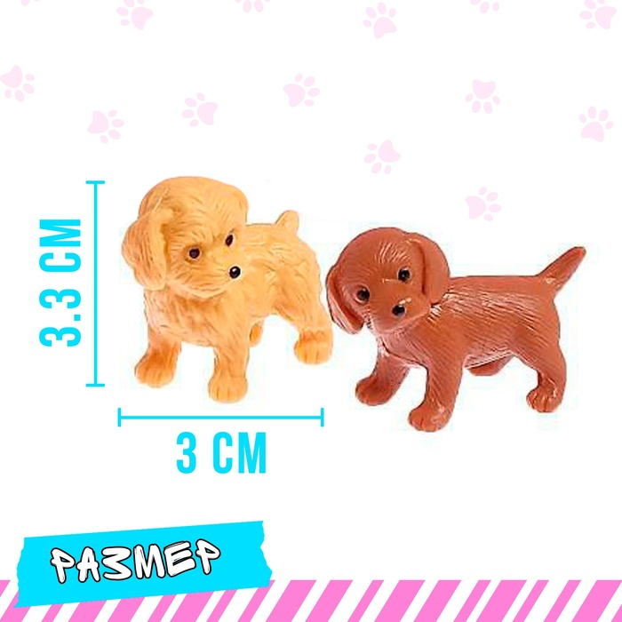 У пёсиков будет свой отдельный домик. Ребёнок покормит их, погуляет с ними. А чтобы щенята не потерялись, прицепит поводок. Малышка посадит животное в переноску и отправится с ним на прогулку. Длина каждого щенка — 3 см. Вся комплектация представлена на фото и в описании.