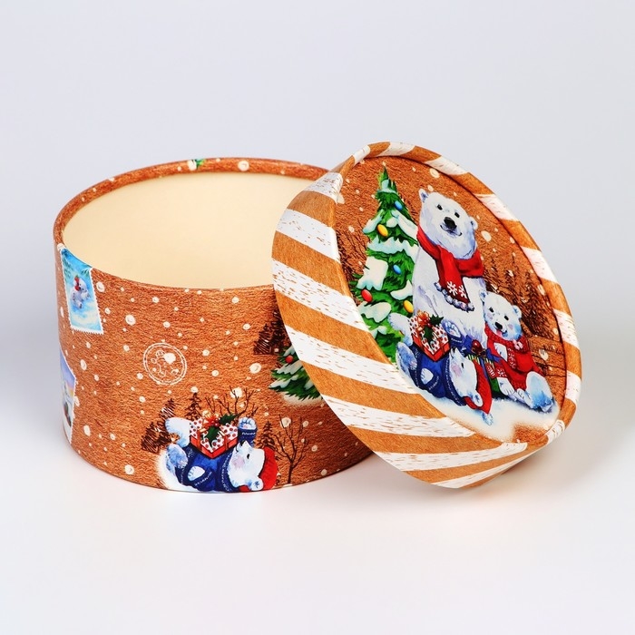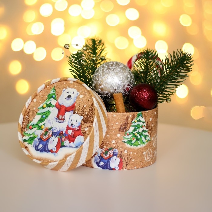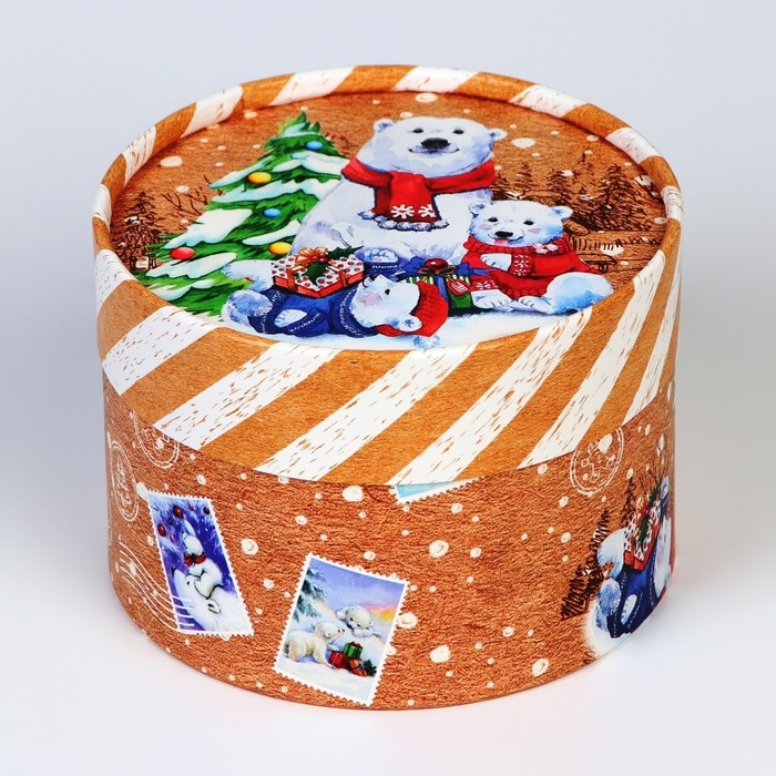 Новый год. Коробка подарочная новогодняя для макарун тубус без окна "Мишки", 12 х 8 см.
