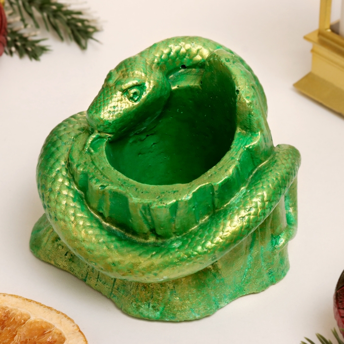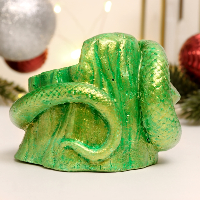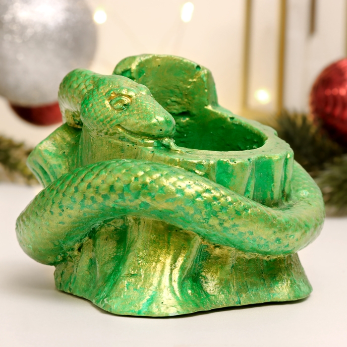 Новый год. Символ 2025. Кашпо "Змея на пеньке" зеленый с позолотой, 10х10см