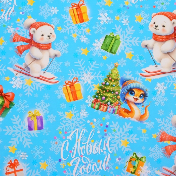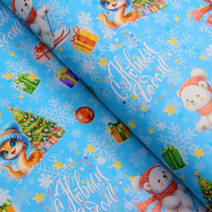 Новый год. Бумага упаковочная новогодняя "Змейка и мишка", глянец, 1 лист, 80 г/м2 , 70 х 100 см