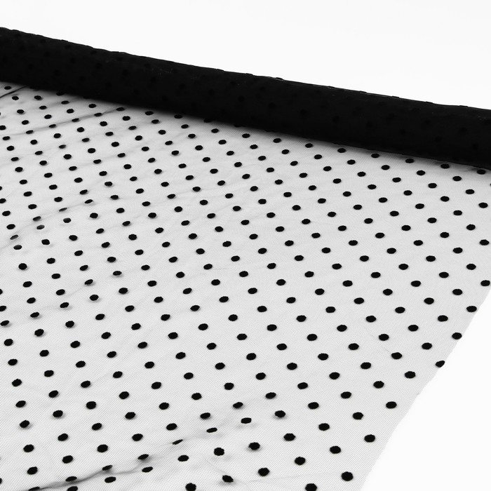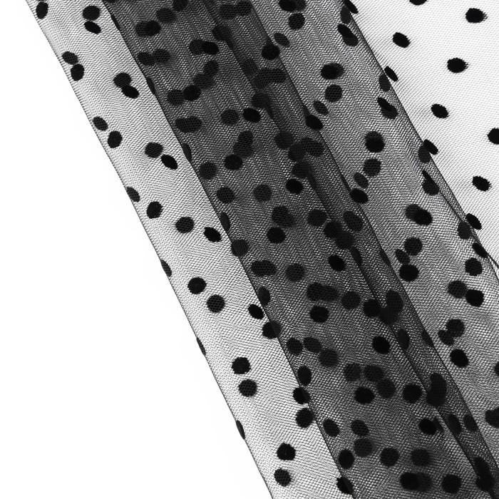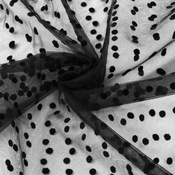 Сетка с флоком «Горох» сочетает в себе элегантность и приятную текстуру. Благодаря своей лёгкости и прозрачности она используется для создания объёмных воздушных дизайнов, вечерних нарядов, аксессуаров для волос, декоративных подушек или других элементов интерьера.