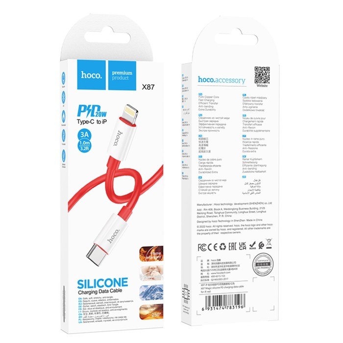 Кабель Hoco X87, Type-C - Lightning, 3 А, 1 м, оплётка силикон, красный