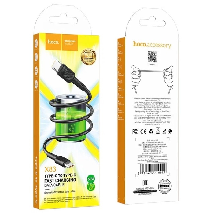 Кабель Hoco X83, Type-C - Type-C, 60 Вт, 3 А, 1 м, передача данных, ПВХ, чёрный