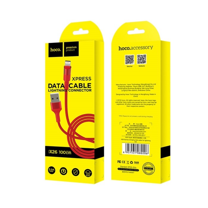 Кабель Hoco X26, Lightning - USB, 2 А, 1 м, передача данных, оплётка нейлон, красный