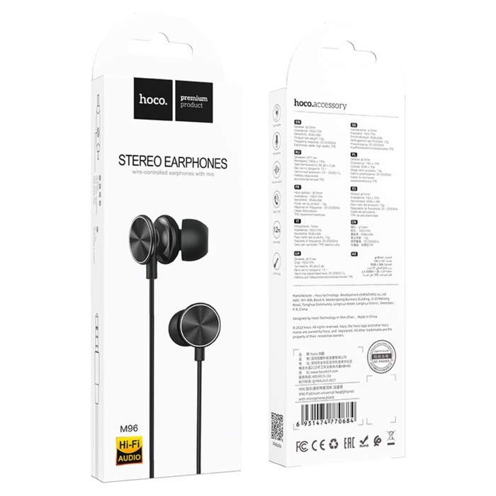 Наушники Hoco M96, проводные, вакуумные, микрофон, 1.2 м, чёрные
