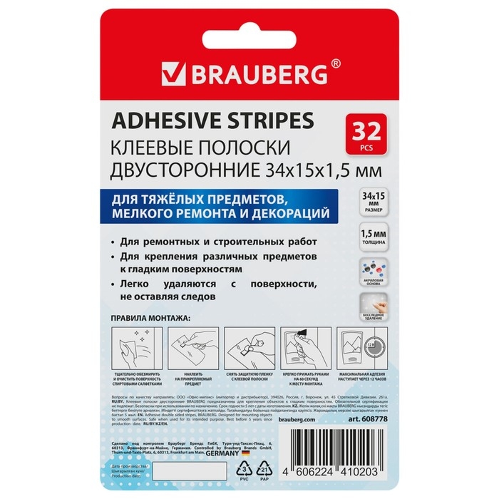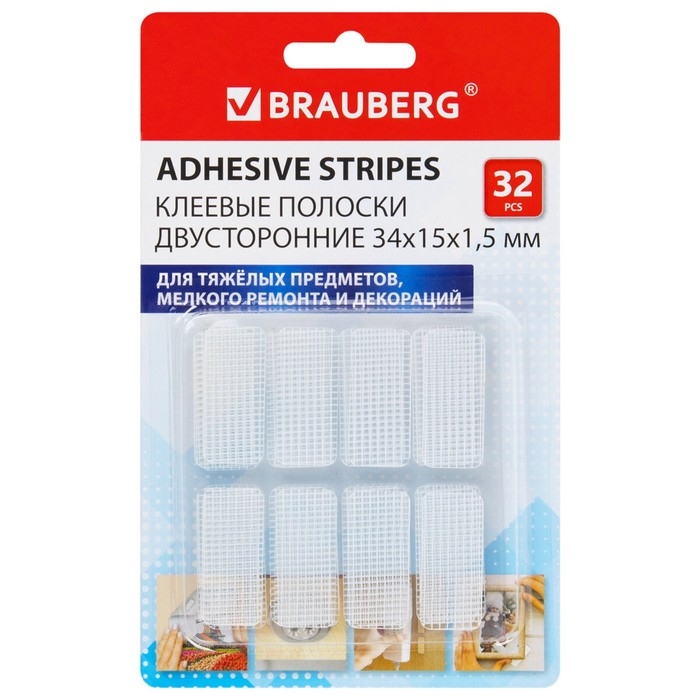 Клеевые полоски двусторонние, 34 мм х 15 мм, акриловая основа, 32 шт., BRAUBERG