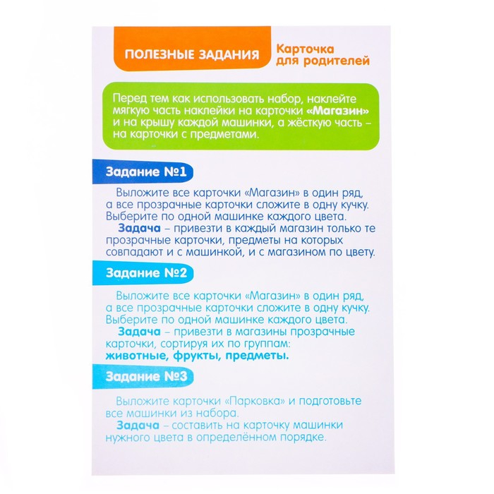 Перед тем, как использовать набор, наклейте мягкую часть наклейки на карточки «Магазин» и на крышу каждой машинки, а жёсткую — на карточки с предметами.