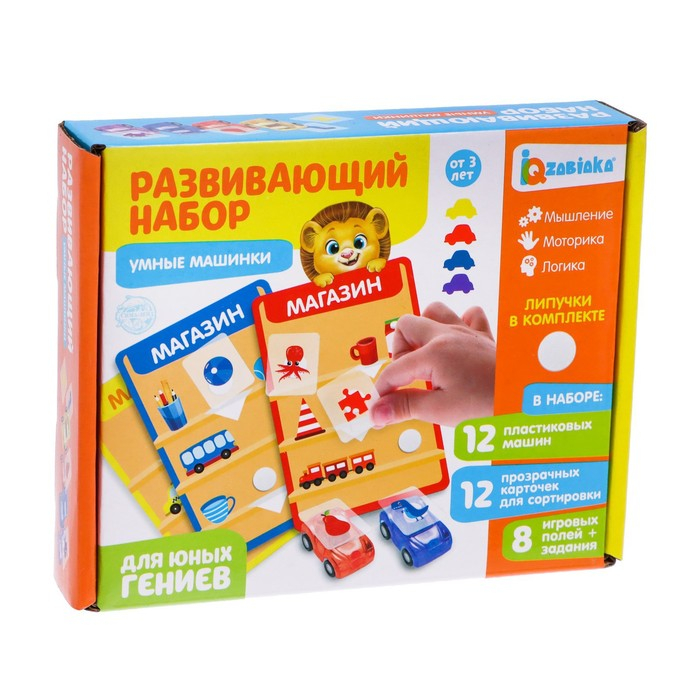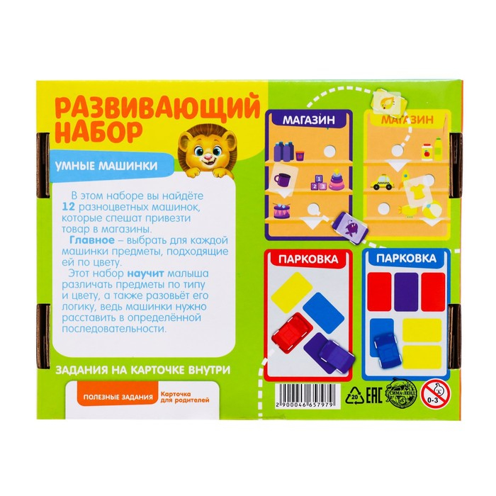 С развивающим набором «Умные машинки» ребёнок научится сортировать фигурки по цвету, а карточки по группам: животные, фрукты, предметы.