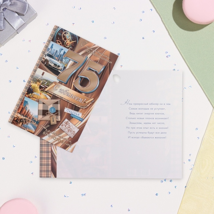 Открытка "С Юбилеем! 75" глиттер, конгрев, автомобиль, 19 х 29 см