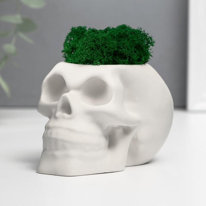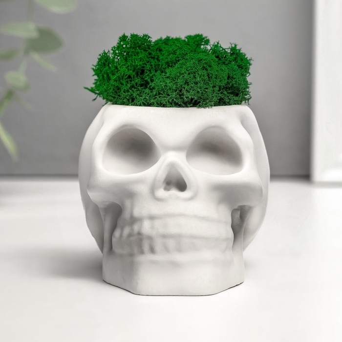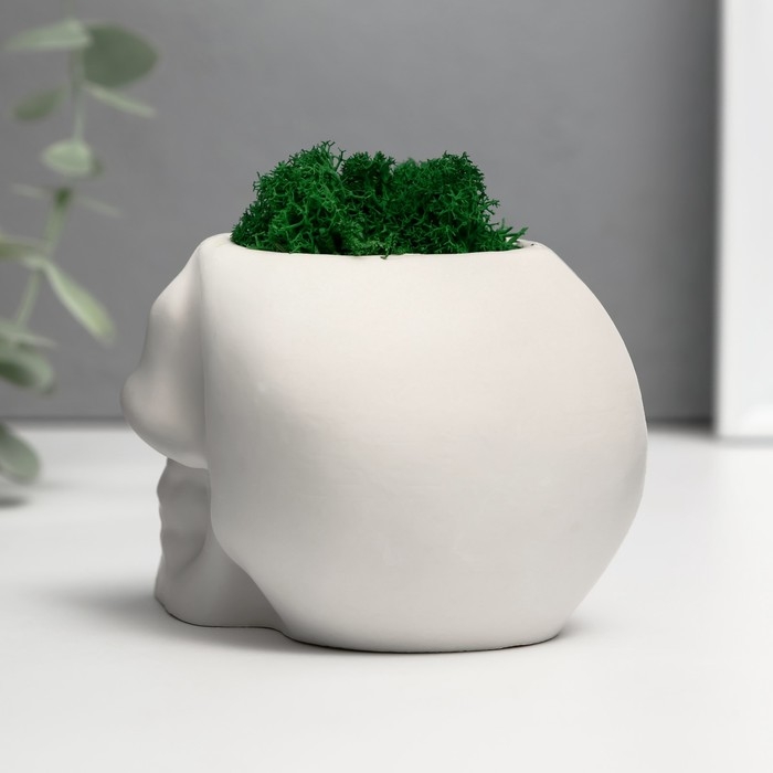 Кашпо бетонное "Череп " со мхом 7х11 см белый (мох зеленый стабилизированный)